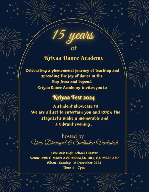 Celebrating a phenomenal journey of teaching and spreading the joy of dance in the Bay Area and beyond. Kriyaa Dance Academy invites you to KRIYAA FEST’ 2024